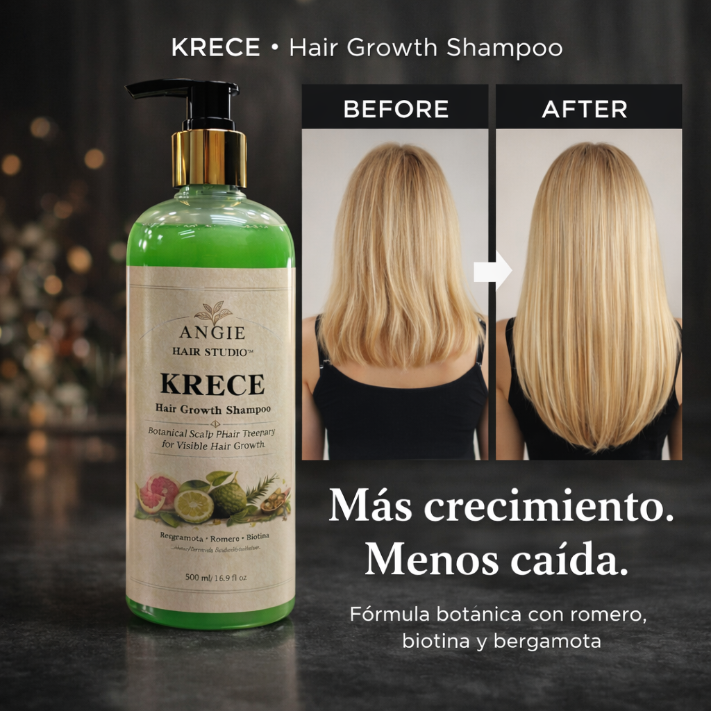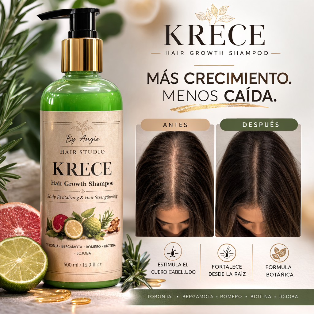 KRECE es un shampoo profesional formulado con ingredientes botánicos y activos capilares que ayudan a revitalizar el cuero cabelludo, fortalecer la fibra capilar y promover un cabello visiblemente más fuerte, saludable y abundante.